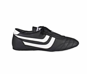 Obuwie wykonane z czarnej skóry syntetycznej, wzmacnianej na piętach, z dziurkami wentylacyjnymi z przodu i na bokach, z białymi paskami.