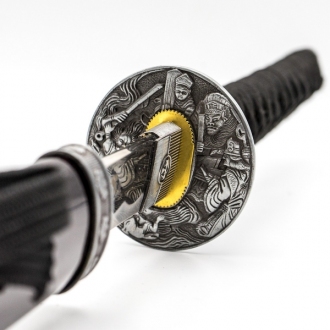 Tsuba, fuchi i kaschira - wykonane z aluminium w kolorze srebrnym.