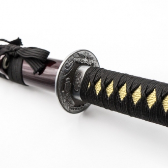 Rękojeść drewniana, wykończona tworzywem naśladującym strukturę skóry płaszczki i owinięta taśmą w kolorze czarnym